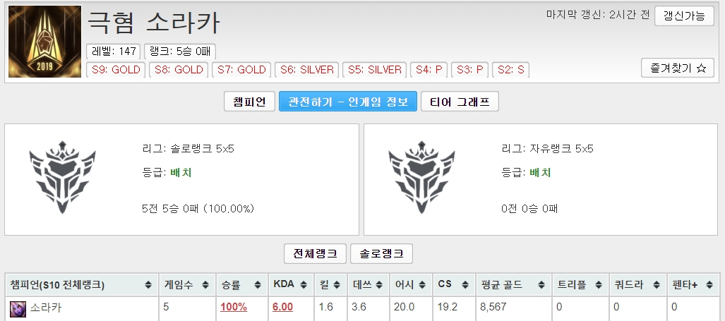 현재 리그오브레전드가 시즌10을 향해 달리고 있는데 아직 배치고사를 완료하지 않은 상태입니다. 총 5판을 뛰었는데 제 전적은 아래와 같습니다.