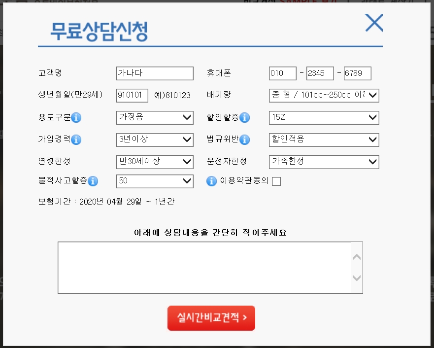 대략 이정도의 조건인데요 나이가 적을수록 사고여부가 존재할 수록 금액은 기하급수적으로 상승합니다. 하지만 정속주행을 하며 사거리 신호를 100% 지키는 등의 안전운전만 했다면 사실상 배달러와 같은 사고는 일어나지 않는데요 이를 통해 계산된 금액은 다음과 같습니다.
