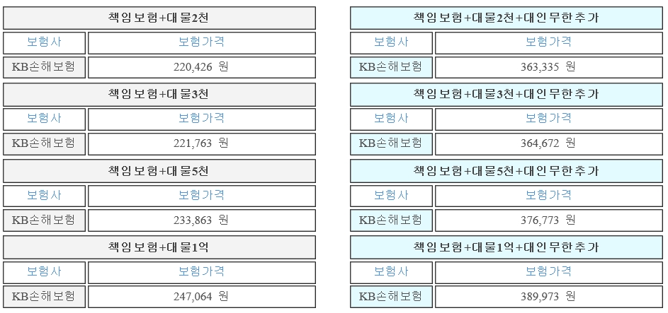 저는 계산된 금액 중 가장 낮은 금액에 대해서 가입을 했었는데 그때나 지금이나 금액은 크게 달라지지 않은 것으로 확인됩니다. 지금도 가장 낮은 금액에 대해서 가입을 해놓은 상태인데(대물2천) 배기량이 높은 만큼 중형으로 올라가도 금액적인 부분은 크게 상승하지 않았습니다. 몇만원 더 상승했다고나 할까요?